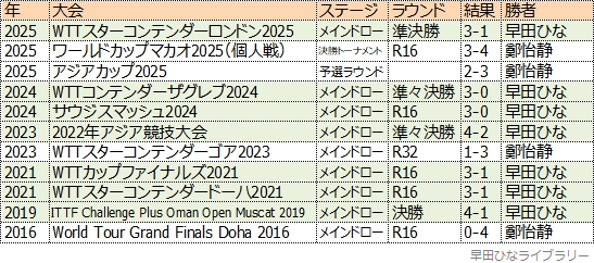 鄭怡静(チェン・イーチン)選手は早田ひな選手と同じ国際大会に良く出場しており、対戦機会が多いです。